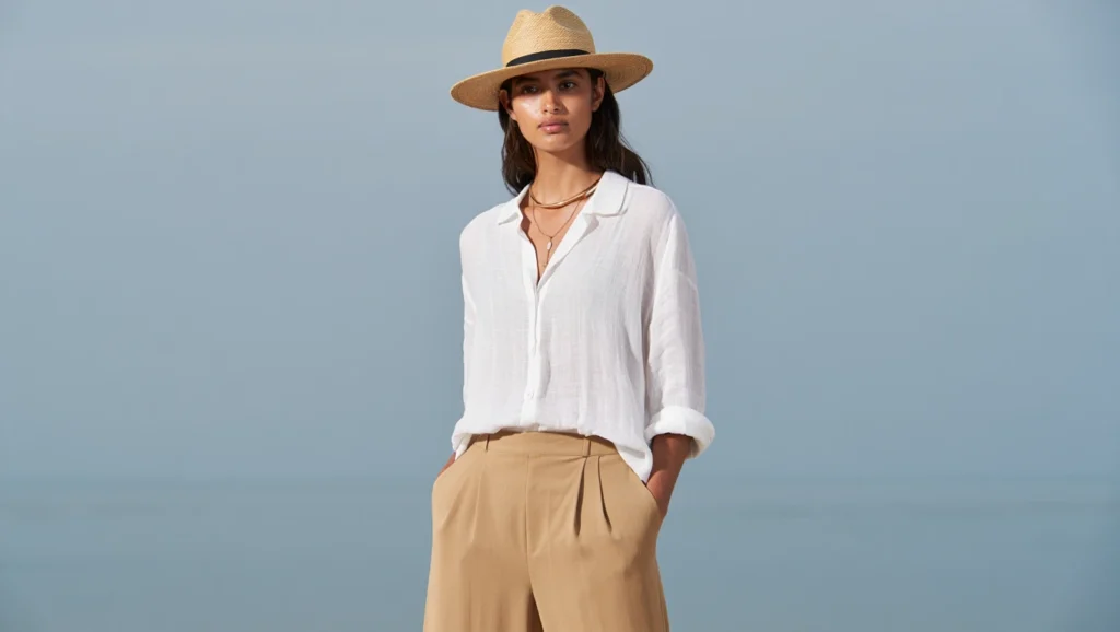 O chapéu panamá combina com peças simples, como camisetas básicas, camisas de linho, shorts de alfaiataria, calças pantacourt e vestidos leves. A mágica acontece justamente na simplicidade: você não precisa exagerar nas combinações.
