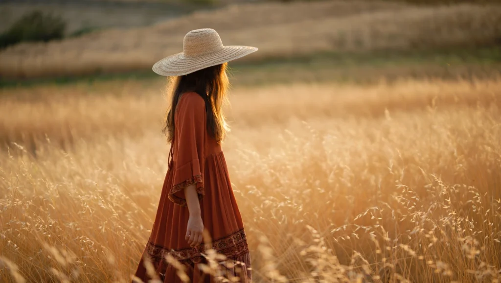 Esse modelo de chapéu encontra seu par perfeito em vestidos longos, saias fluídas, batas, rendas e tecidos naturais. Tons terrosos, estampas florais e sobreposições ajudam a construir esse visual que parece despreocupado, mas é cheio de intenção.