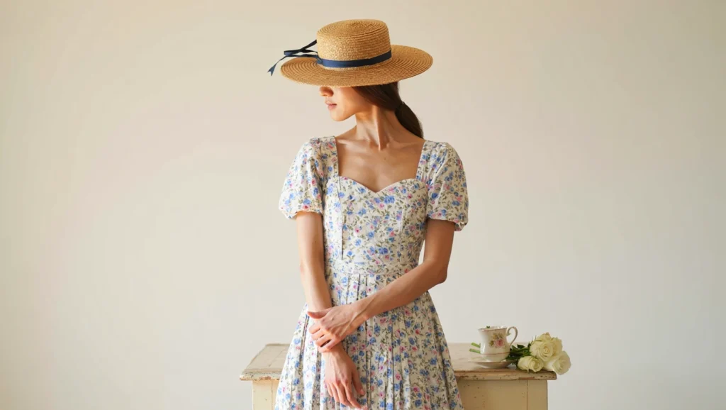 O chapéu adiciona um ar delicado, quase poético, como se o visual tivesse saído de um filme ou de uma tarde ensolarada no interior.