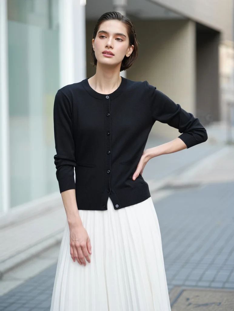Uma tendência forte que vem ganhando espaço é usar o cardigan fechado como se fosse uma blusa. Essa proposta transforma completamente a peça, trazendo um visual moderno e minimalista.