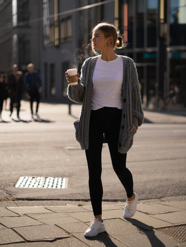 Outra dica importante é equilibrar as proporções. Como o cardigan oversized é amplo, o ideal é combiná-lo com peças mais ajustadas na parte de baixo, como leggings, jeans skinny ou saias retas.